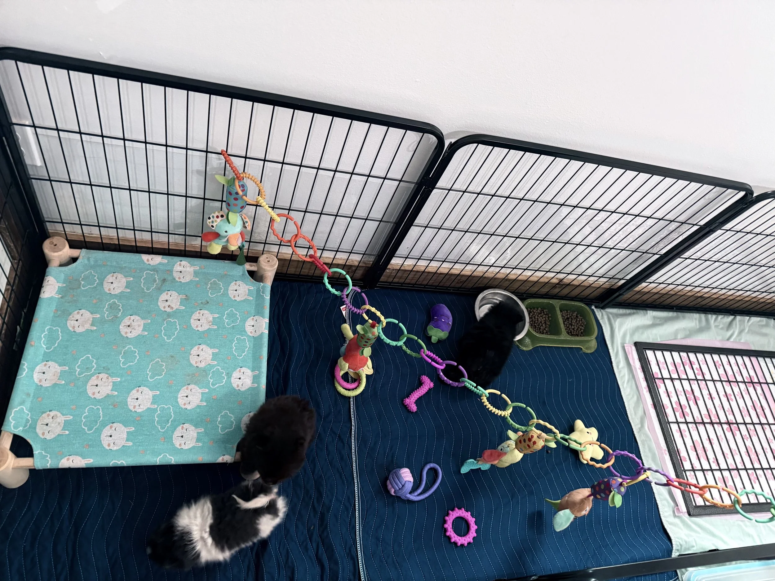Our nursery is where the beginning of all of our puppies lives. Every single one of our moms are provided their own individual whelping kennels, big enough for them to have space if they need it but small enough that their babies are right there whenever they need their mommy. All of our moms are on diamond puppy chow which is intended for all life stages and is specifically formulated for nursing moms and their puppies. If we have more than 1 litter at a time we have amazing cloth dividers that separate the moms from being able to see each other or the other puppies. We also have covers that fit perfectly on top of the whelping kennels for mothers who like to climb out for a bit of their own freedom. All of our moms are free fed giving their puppies the opportunity to learn how to eat/wean themselves as they age, around 6 weeks old our puppies are taken in to see our amazing veterinarian where they receive a full health exam, deworming, and their first booster. Pending our vets approval we will start to wean our puppies from their mommies between 6 and 7 weeks, in rare cases we will keep them with their moms throughout the entire process as long as their moms have properly weaned them, themselves to give them the ability to thrive in a new home environment, once our puppies start their weaning process, we transition them to a larger kennel that provides a pee pad area, dangle toys, cots, and squeaky/teething toys to be able to start socializing with their siblings and other nursery pups that are also weaned from their moms. In most cases, all of our puppies and moms are kept in the nursery throughout their entire stay, our moms are given their own space and kept inside our home until their babies leave, and then they return to their normal lives being spoiled pets. In rare cases we will keep our moms in the nursery for an extended period of time after their puppies leave to ensure we have 24/7 eyes on them incase of mastitis and/or depression. We pride ourselves in our nursery set up, cleaning multiple times a day, checking on puppies occasionally when we have a new or high risk litter while trying to keep ourselves from interrupting them too much. We try to limit the amount of photos we take especially during the first few weeks to give our moms the ability to bond to their pups without too many daily interruptions (besides potty breaks).