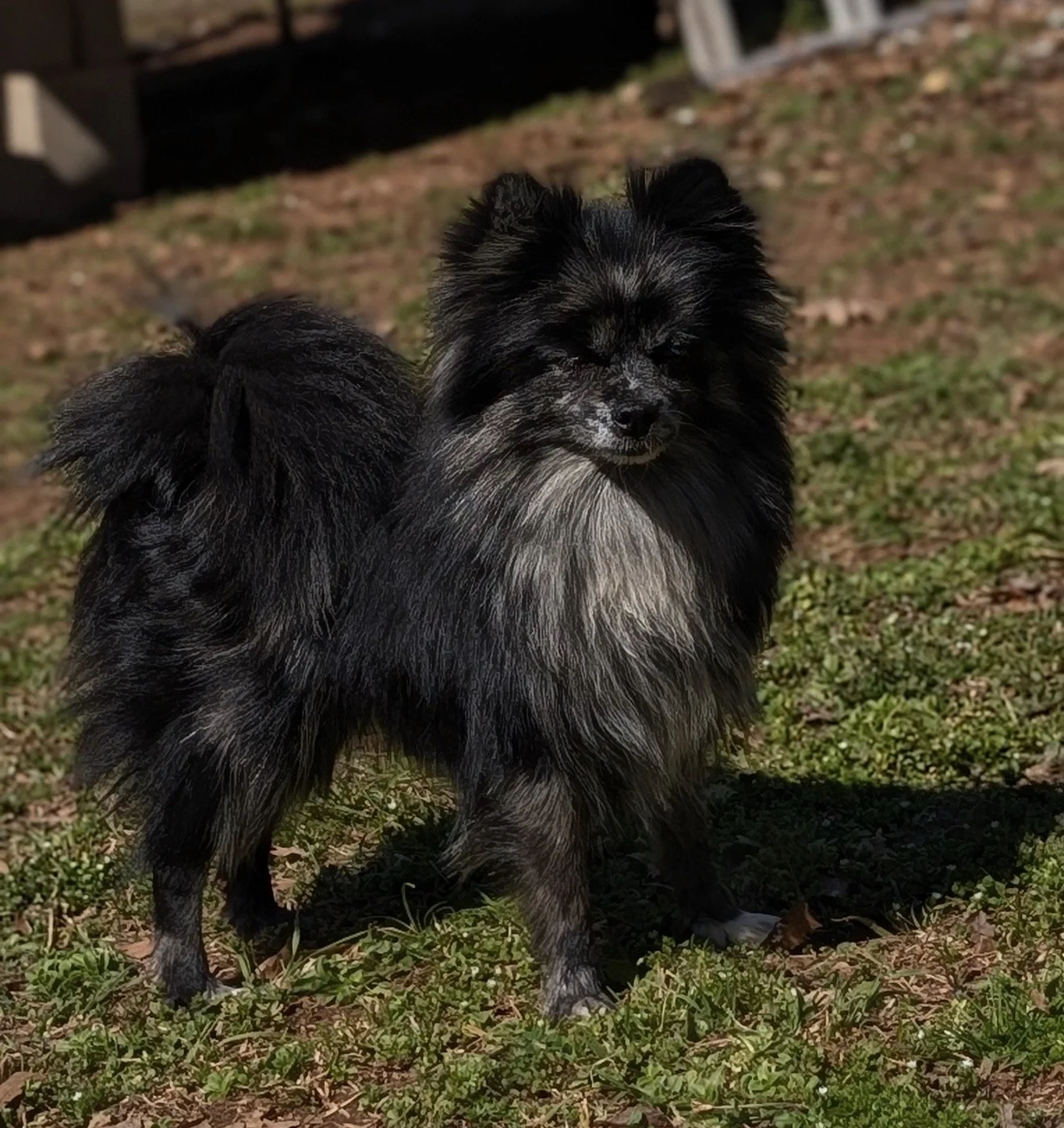 Skittles is a striking black/blue merle female, weighing 7 lbs. She has produced two litters with H.P.P Kennels and combines an excellent temperament with attractive conformation. Quiet by nature, Skittles still has a lively, playful side and enjoys socializing with her housemates.